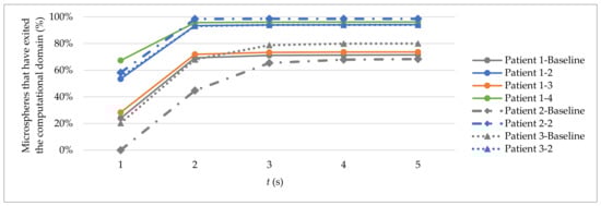 Reducing computational times by effectively reducing the hepatic artery geometry is the main goal of this study. In order to reduce the computational time, the size of the computational domain can be reduced. This reduction potentially allows for an additional reduction in simulation times because a smaller number of cardiac cycles are necessary to ensure that most of the injected microspheres exit the computational domain. Before carrying out the present study, a preliminary study was conducted to analyze the influence of the number of cardiac cycles simulated on the fraction of injected microspheres that exited the computational domain. The computational domains used in this preliminary study were not the same as the ones reported in the present study. Results can be regarded as representative because the baseline geometries are the same in the preliminary and actual studies and the reduced geometries are similar in the preliminary and actual studies. Figure 12 shows the fraction of microspheres that have exited the computational domain over time since the start of the injection—microspheres are injected between 0 s and 1 s, t = 1 s is the end of the first cycle (injection cycle) without microsphere injection t = 2 s is the end of the second cycle (extra cycle 1), etc.