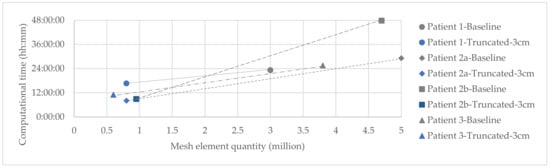 Finally, the relation between the number of mesh elements and the simulation duration was studied for the “Baseline” and “Truncated-3cm” geometries of the actual study, shown in Figure 13. The first observation is that simplifying the geometry results in a reduction in the computational time in all cases. This trend was expected due to the reduction in the number of mesh elements, but it can be quantified. The reduction in Patient 1 is from 23 h and 13 min to 16 h and 38 min (i.e., 28.4%); in Patient 2a, from 29 h and 11 min to 8 h and 03 min (i.e., 72.4%); in Patient 2b, from 47 h and 48 min to 8 h and 52 min (i.e., 81.5%); and in Patient 3, from 25 h and 35 min to 11 h and 00 min (i.e., 57%). Another observation is the fact that all the “Truncated-3cm” computational domains consist of a similar number of elements (near one million elements), even though the “Baseline” geometries differ in the number of elements. This comes as a result of applying the same geometry reduction strategy. It is also important to note that other factors that influence the simulation time include the quality of the elements of the mesh and the complexity of the studied blood flow.