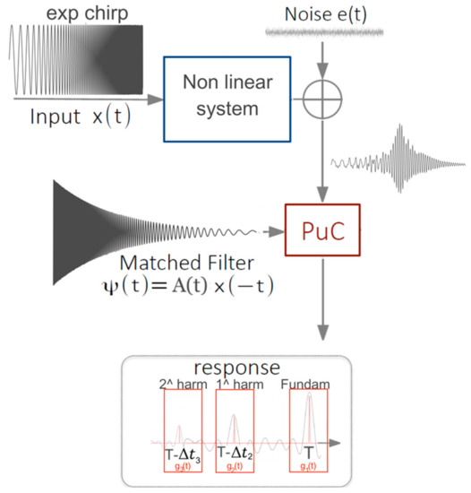 This identification technique turns out to be particularly suitable for the early detection we are interested in, as it allows us to adjust the signal-to-noise ratio through the most opportune choice of the parameters that characterize the coded signal used for the excitation of the system. Figure 2 provides a schematic description of the PuC procedure for identifying the Hammerstein model of the non-linear system under consideration: the functions highlighted by red boxes at the output of the matched filter are those whose transformation through the matrix allows us to obtain the kernels present in the Hammerstein model in Figure 1. The functions are also those that will be used in the definition of the indicator that we propose in a later section of the paper.