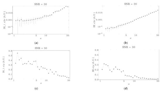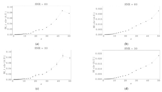 Figure 4 shows, in the four panels, the trend in the case of SNR = 60 dB and in the case of SNR = 30 dB of the mean value and the standard deviation (±2) of the estimator of the two damage indicators being compared. The abscissa shows the extent of damage α, whose value varies between 0% and 50%. The mean value and the standard deviation are calculated, as in all subsequent cases, on 30 independent tests.