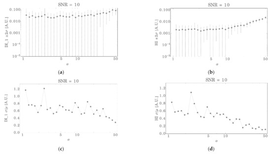 Mean value and standard deviation (±2) of the estimators depending on the amount of damage α. (a) Double logarithmic scale representation of damage indicator @ SNR = 10 dB; (b) double logarithmic scale representation of the proposed damage indicator HI @ SNR = 10 dB; (c) for @ SNR = 10 dB; (d) for HI @ SNR = 10 dB.