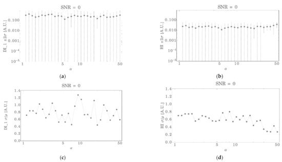 Mean value and standard deviation (±2) of the estimators depending on the amount of damage α. (a) Double logarithmic scale representation of damage indicator @ SNR = 0 dB; (b) double logarithmic scale representation of the proposed damage indicator HI @ SNR = 0 dB; (c) for @ SNR = 0 dB; (d) for HI @ SNR = 0 dB.