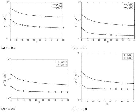 The results for the perturbation bound, (8)–(13) from Theorem 1, visualized on Figure 1 and Figure 2 demonstrate that the perturbation bound, (8)–(13) is an effective upper perturbation bound ofin a large range of the size n of the NDRE (1) (n varies from 5 to 50). With the increasing of the dimension n of Equation (1), the accuracy of the estimate improves.