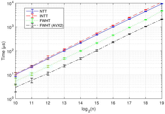 - Harvey, D. Faster arithmetic for number-theoretic transforms. J. Symb. Comput. 2014, 60, 113–119. [Google Scholar] [CrossRef]
