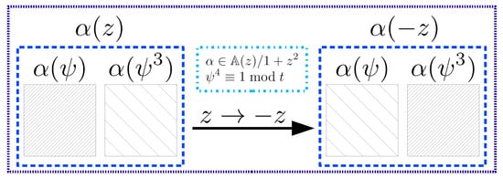 By restricting ourselves to the most common scenario of “power-of-two” cyclotomics (we must clarify here that we refer to polynomials with only two non-zero terms: the leading and the constant coefficient of the polynomial), polynomial ideals of the form , could avoid BCV attack for some parameters . E.g., the rings and do not have common roots, so trivial substitutions such as cannot be applied. Additionally, whenever we reduce modulo q and work over , we can impose (for the sake of efficiency) that both polynomials functions and factor in linear terms enabling the use of variants of the NTT. Additionally, slot encoding and slot manipulations are still possible in the plaintext ring by means of the pre-/post-processing, as presented in []. Analogously to the negayclic convolution, these pre-/post-processing steps preserve the properties of the NTT transform over a ring with an -generalized convolution [].