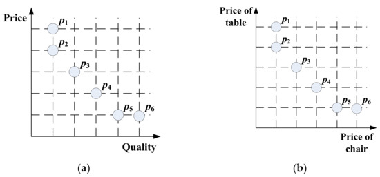 In contrast, you may possibly plan to buy a cheapest table and a cheapest chair at once, which is a typical multi-task optimization problem. In Figure 2b, individuals {p1, p2} are the cheapest chairs, and individuals {p5, p6} are the cheapest tables in this furniture store. Thus, the output of this MTO problem is two optimal solution sets: {p1, p2} and {p5, p6}, and then you can buy randomly ONE table from the set {p5, p6} and ONE chair from the set {p1, p2}.