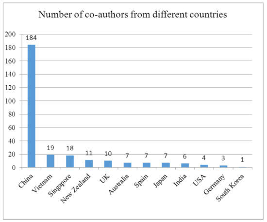 These articles involve 277 co-authors from 12 countries, including China (184), Vietnam (19), Singapore (18), New Zealand (11), and the UK (10), as shown in Figure 5. The most prolific contributing authors in this field are summarized in Table 2. From here we see clearly that China and Singapore have demonstrated great research power in this field, and some famous research teams have emerged from China and Singapore. It is worth noting that these prominent scholars have some kind of academic connection (research scientist, Ph.D candidate, co-investigator, etc.) with the pioneer of MTO, Prof. Ong. In addition, each paper was written by 4.21 co-authors on average.