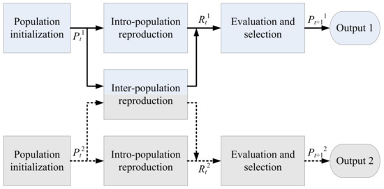 Evolutionary algorithms (EAs) are a kind of population-based stochastic optimization methods involving the Darwinian principles of “Natural selection and survival of the fittest” [4,5,6,7,8]. The algorithm starts with a population of randomly generated individuals. Then, new offspring are produced iteratively by undergoing evolutionary operators such as crossover and mutation, and fitter offspring will survive to the next generation. The production and selection procedure terminates when a predefined condition is satisfied. Due to their simple implementation and strong search capability, in the last few decades, EAs have been successfully applied to solve a wide range of real-world optimization problems in areas such as defense and cybersecurity, biometrics and bioinformatics, finance and economics, sport, and games [9,10].