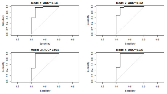 Table 4 shows the detailed results for the four best performing models, already using a fit with all BG data. In all four cases, the parameter values and their corresponding odds ratio, as well as the p-value, were calculated. Likewise, the VIFs were computed to verify the absence of multicollinearity problems, and the absence of autocorrelation in the residuals was verified by means of the Durbin–Watson test. It can be seen that in all cases, Nagelkerke’s R2 has relatively high values, and the ROC curves (Figure 1) also show a high AUC above 0.9, which is usually considered to be a good result. Specifically, values of 0.93, 0.95, 0.92 and 0.93 were obtained in each of the four models. Therefore, we can conclude that all of them present good behavior in the BG.