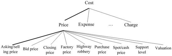 WordNet is an extensive lexical dictionary of English which groups nouns, verb, adjectives, and adverbs into sets of cognitive synonyms, called synset, to represent semantic relationships between words with the tree structure. Take the term price, for example. We can find the direct hypernym of price as cost, and the direct hyponym as asking/selling price, bid price, closing price, factory price, highway robbery, purchase price, spot/cash price, support level, and valuation to form the tree structure as shown in