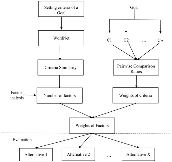 The major distinction of the paper is that we revise the conventional AHP by incorporating the criteria similarity and explorative factor analysis. The criteria similarity is calculated via the WordNet database. Hence, we do not need extra costs or questionnaires to obtain the needed information. Then, we can use the explorative factor analysis to derive the independent factors from the correlated criteria. Finally, we can use the results of the AHP for the correlated criteria and factor loadings to calculate the weights of factors. Hence, the evaluation of alternatives will depend on the factors’ weights rather than the correlated criteria.