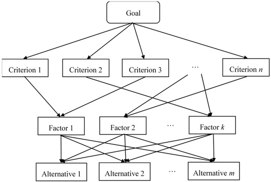 Figure 6. The first level is the goal of the problem. The second level is the considered criteria of the goal. The third level indicates the factors which are determined by the result of the factor loading. The last level is the candidate alternatives which are affected by the factors.