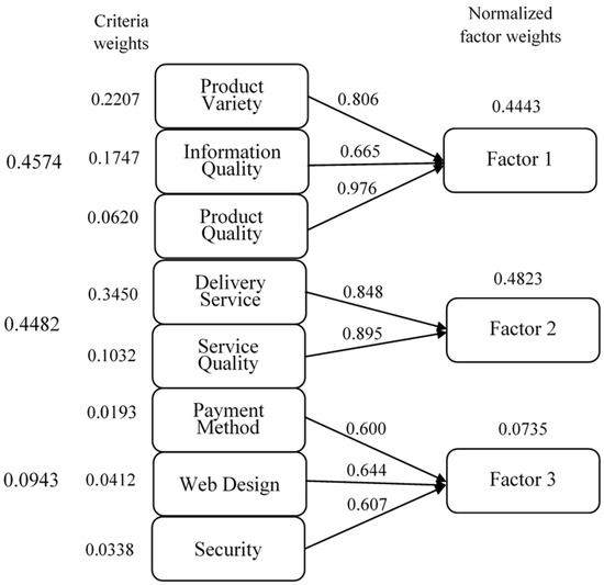 Note that the normalized factor weights might have a reversal rank with respect to the composited criterion weights. For example, the summation of the weights of the product variety, information quality, and product quality is equal to 0.4574, but the normalized weight of Factor 1 is 0.4443, i.e., ranked from the first to the second of the three factors. These differences might result in different decision-making for the problem. Next, we consider further discussion based on the results above.