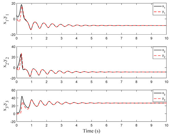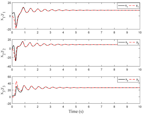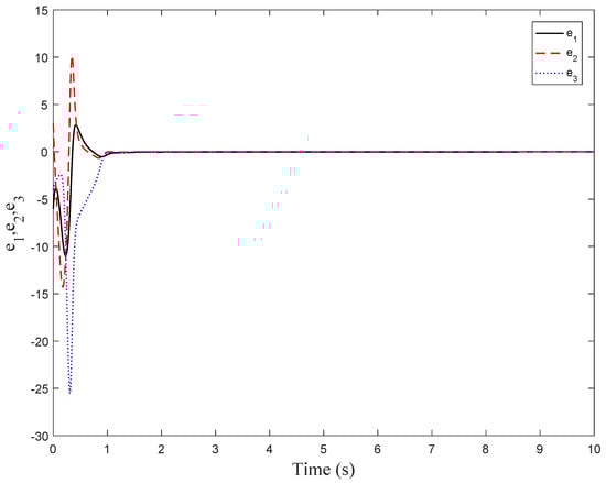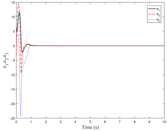 Numerical simulation is carried out by choosing the initial conditions of the drive system (28): , the initial conditions of the response system (24): , and , , . Figure 1 shows that the error system (29) is asymptotically stable, that is to say, the drive system (28) and the response system (24) realize complete synchronization. The states of the drive system (28) and the response system (24) are displayed in Figure 2, respectively. Figure 3 demonstrates converges to a constant.