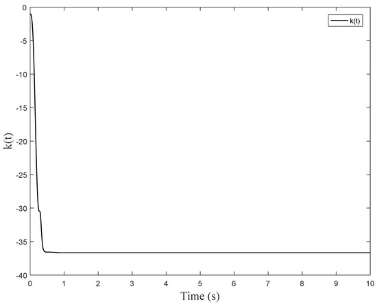 Numerical simulation is done with the initial conditions of the drive system (22) and the response system (24): , , respectively, and , , . Figure 4 displays the synchronization error tends to zero, which implies that the drive system (22) and the response system (24) reach complete synchronization. Figure 5 demonstrates the states of the drive system (22) and the response system (24), respectively. Figure 6 represents that the feedback gain tends to a constant. From Figure 7, it is clear that converges asymptotically to .