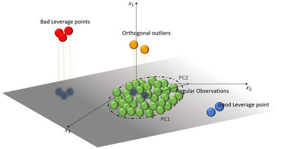 An example of this behavior is shown in Figure 1, where four types of points can be distinguished, depending on the location of the observation. These points can be categorized as: Regular Observations (ROs), which form a homogeneous group near the PC subspace generated by the principal components; Good Leverage Points (GLPs), which are at the same plane as the PC subspace but distant from the ROs; Orthogonal Observations (OOs), which have a large orthogonal distance to the PC subspace, but whose projection is on the PC subspace; and, finally, Bad Leverage Points (BLPs), which have a large orthogonal distance such that the projection on the PC subspace is away from ROs.