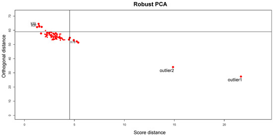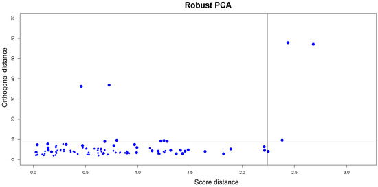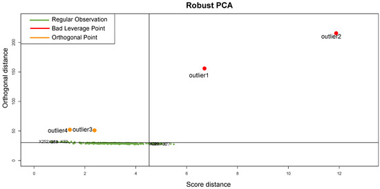 where and are the MCD estimates for the mean and standard deviation of the above normal distribution, and is the quantile of the Gaussian distribution. Figure 2 illustrates an example of the outlier map described.