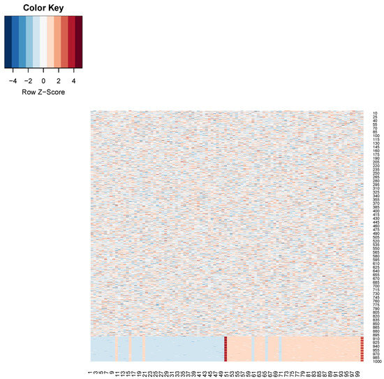 We have 1000 genes in the rows and 100 samples in the columns (50 for each class). The first 900 rows are drawn from the same normal distribution for both classes, and the remaining 100 were drawn from different distributions for samples of classes and , respectively. In addition, three samples of class were swapped with three samples of the second class . Finally, the last sample of each class was replaced by one with a different distribution (e.g., the Poisson distributions with and , respectively). A graphical representation of this structure can be found in Figure 4.
