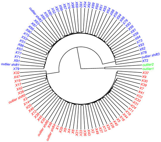 Circular dendrogram of first artificial dataset. The two classes are clustered correctly, respectively, in blue and in red. From the graph, it can be seen that the samples moved from one class to another (in the labels underlined with the word “shift”) are repositioned in the correct class. The two samples with different distribution are in green.