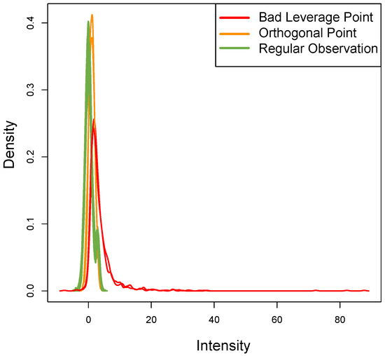 Figure 8 shows the density of each outlier sample: this plot qualitatively confirms the data assumptions above. The ROs show the typical bimodal trend present in real datasets, the OOs have a different trend but with the same distribution, while the two BLPs with t-student distribution (as expected) show a different trend.