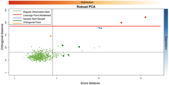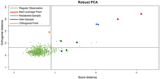 Graphical representation of the outlier classification (with and ) according to the location of each observation with respect to the PCA subspace.