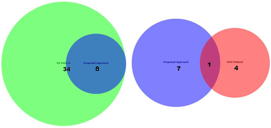 To strengthen the study on the reliability of our method, we compared it with standard techniques proposed in the microarray literature (as explained in Section 2): (i) the method based on Kolmogorov-Smirnov distribution, hereafter referred to as KS, and (ii) SUM (Sum operation by column), the mechanism that assumes total weight among genes. As before, only the results for Datasets A are reported here (see Appendix A, Appendix B, Appendix C and Appendix D for the complete overview of all biological datasets). KS individuates 34 outliers: this is a high number compared to the nature of biological outliers, which are expected to be very small. The reason is probably that the KS procedure is based on a probability distribution distance. In contrast, SUM finds several outliers and only one outlier compared to our approach. Figure 12 shows the Euler-Venn diagram (drawn using an online tool for comparing and visualizing biological lists with area-proportional Venn diagrams) [41] for the sets of outliers detected by the three mechanisms on Dataset A, and, Figure 13 shows the study of the degradation of the additional samples obtained by the comparison techniques.