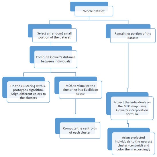 The main objective of this work is to provide a procedure to construct and visualize profiles, i.e., groups of individuals with similar characteristics, for weighted and mixed data by combining two classical multivariate techniques, MDS and the k-prototypes clustering algorithm []. Since classical MDS suffers from computational problems as sample size increases, we propose instead a "fast" MDS based on the selection of a small random sample, which is clustered by means of an adapted version of the k-prototypes algorithm that can cope with Gower’s metric and weighted data. At the same time, the selected sample is mapped onto an MDS configuration and the remaining objects are projected onto the previous configuration via Gower’s interpolation formula. The profile visualization is achieved by assigning each projected object to the closest cluster’s centroid and coloring it accordingly. Finally, profile main characteristics are computed as the “average” member of each cluster, where the mode is considered for categorical variables and the means or the medians for quantitative ones. We give a flowchart with an overview of the algorithm steps in Figure 1.