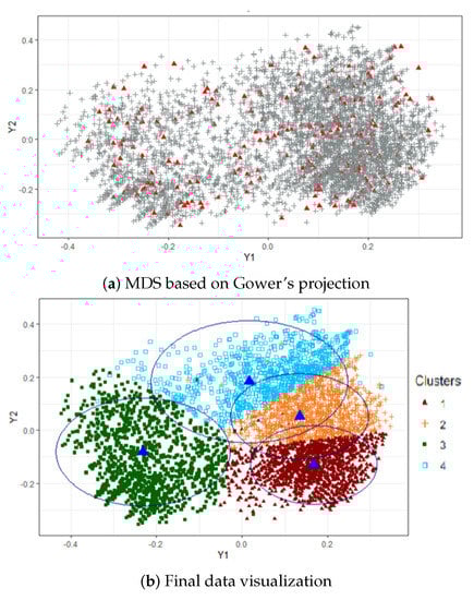Note that our proposal starts by clustering the individuals in the original space, and next, we use MDS to visualize the clustering in the Euclidean space. For that reason we use a clustering algorithm able to cope with mixed data, k-prototypes (although other methods can be used [,]). Another possibility would be to start with the MDS representation and next do the clustering on the Euclidean space using k-means clustering. In any case, when working with large datasets, a “fast” MDS is required in order to reduce both computational time and memory use. Thus, in any case, the idea of applying the methodology to a small portion of the data and to project the remaining individuals on the MDS-map remains. In this work, we explore the former; that is, we cluster the individuals in the original space instead of doing the clustering on the MDS-map, since an additional motivation was to incorporate Gower’s distance in the k-prototypes clustering algorithm.