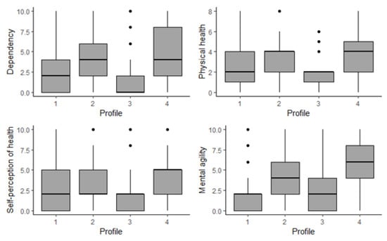Clearly, the least disadvantaged group was P3, which heavily skewed towards younger individuals, since almost 60% of the individuals were aged between 55 and 60, and those over 76 made up less than 5% of this profile. In addition, 57.27% of them were women, and they tend to work until an advanced age. In addition, the indices indicate good health for this group, which may be related to the fact that continuing working in later life has been proved to be correlated with positive health outcomes []. Low values in wellbeing indices are consistent with the fact that people in this profile have no health-related benefits.