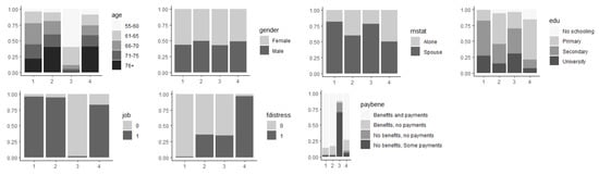 Finally, we see that education is one of the factors that most influences the profiles’ differences. Notice that most disadvantaged profiles have in common lower education levels (secondary, primary or none), whereas the most advantaged always have a high percentage of members who attended university. This finding supports the idea that society’s disparities are explained by differences in education among individuals. Education is often used as a proxy for socioeconomic status and its impact on later-life health outcomes is well researched [,].
