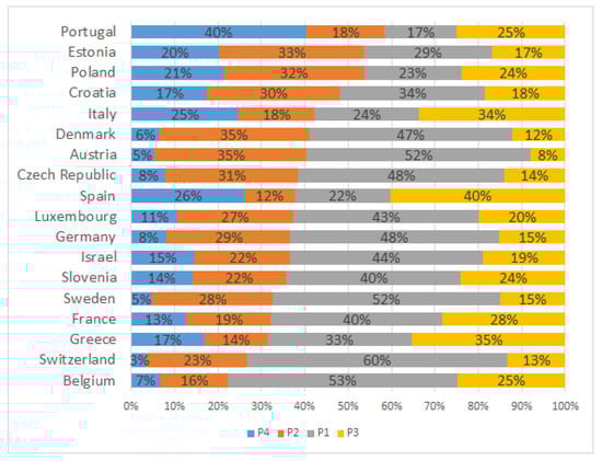 The variable “country,” which represents the country of residence of the individuals, was not included in the process described so far. However, it seemed interesting to see how the profiles are distributed across Europe, particularly for the most disadvantaged ones. Thus, for each country we computed the percentage of people belonging to each profile. Results are shown in Figure 6, where it can be seen that a combination of the least disadvantaged profiles is predominant in most European countries, except for Portugal, Estonia and Poland.