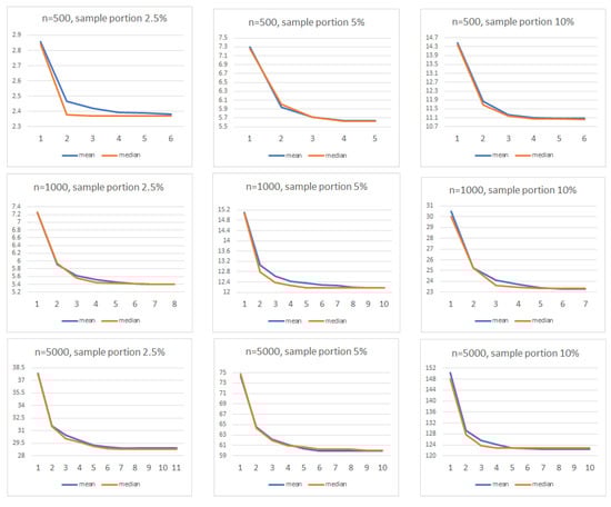Finally, we illustrate the convergence of the cost function of the k-prototypes algorithm, for and several of the scenarios described above. In Figure 7 we depict the mean and median values of the corresponding cost functions for which convergence was achieved in a rather small number of iterations.