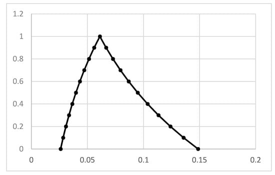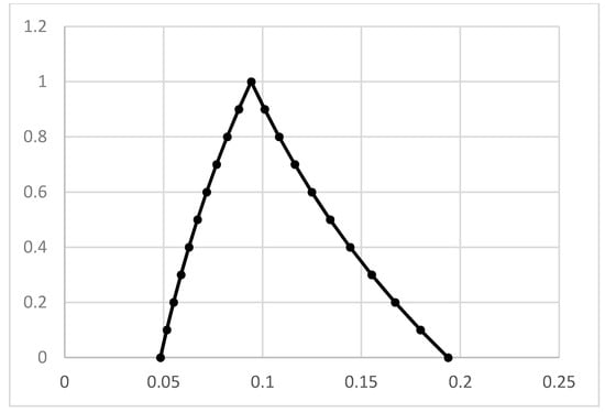 When expanding into the α-level sets of fuzzy numbers, the values of the inverse to the membership functions on the intervals of increasing and decreasing were calculated: . A single-valued inverse function f–1(y) exists on the interval [x1, x2] if the function f(x) is continuous and monotone on this interval. This is why, from the set of all fuzzy numbers, a class of normal, unimodal fuzzy numbers with convexity to the left and right form the maximum point of the membership function.