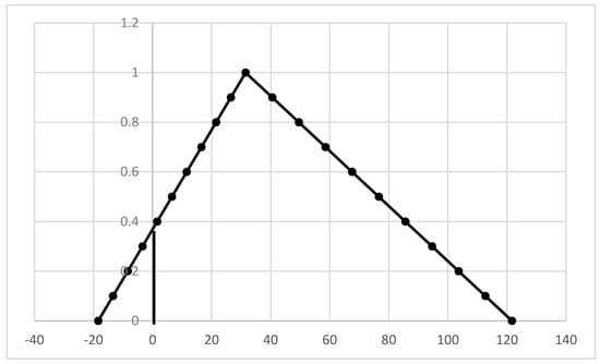 All parameters in Formula (2) are fuzzy, i.e., their exact meaning is unknown but can be determined in a certain interval. The distribution within this interval is also an unknown function, then, as an estimate of the initial data, the theory of fuzzy sets recommendations using triangular fuzzy numbers with a standard membership function. Triangular numbers simulate the following natural language statements: “x is approximately equal to and is in the range ”. This approach makes it possible to formulate three types of the scenario for assessing the value of a biological asset: pessimistic, typical, optimistic.