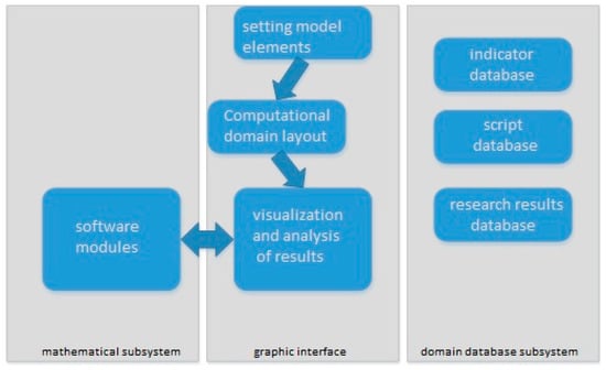 2. The instrumental graphical subsystem implements a graphical interface and provides visual preparation of the model’s object or economic process under consideration, the layout of the computational domain for convenient placement of elements in the workspace of the webserver, and interaction with the full set of scenarios and indicators used for modeling.