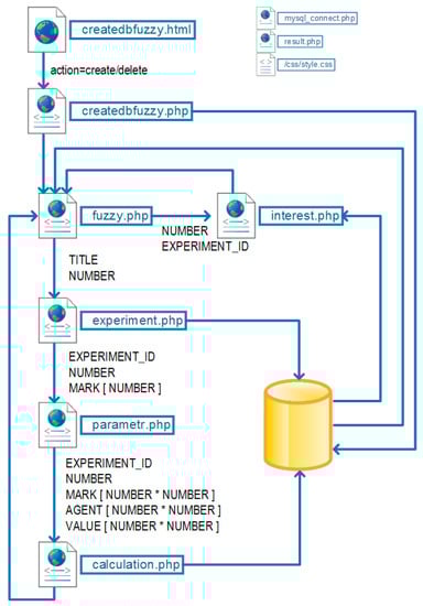 A user’s request to the web service initiates a request to a database, which entails the creation of an associative array, the elements of which are sequentially sent to the interest.php page. The script for this page prompts the user to perform data entry actions that are accumulated in the experiment.php page. The page parameter.php, without accessing the database, creates two arrays, MARK [NUMBER * NUMBER] and AGENT [NUMBER * NUMBER], with the name of the parameters and one array, VALUE [NUMBER * NUMBER], with values corresponding to the mutual influence of the parameters on each other, which are sent to the calculation.php page, where the necessary calculations are made.