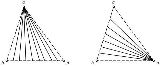 The law of synthesis defined in Example 4 on the set of the points of a Euclidian geometry is associative. For the verification, it is required to consider many cases. The following Figure 3 presents the general case for the open hypercomposition, in which the points are not collinear. The result of bothandis the interior of the triangle.