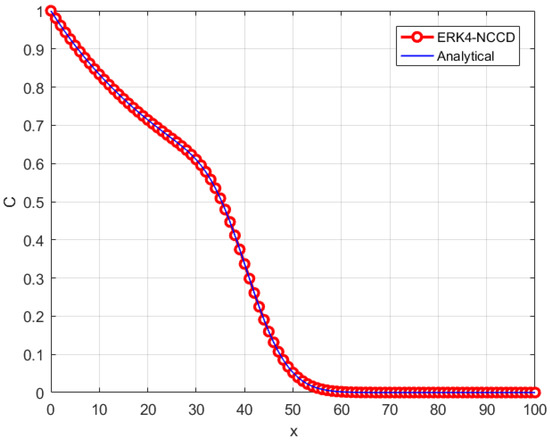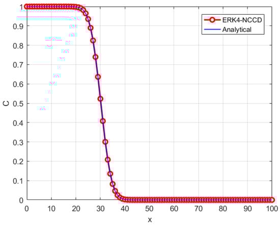 In this example, the velocity and the diffusion coefficient increase depending on the value of . The numerical results at s for different time steps and are presented in Table 4. Table 4 shows that the ERK4-NCCD scheme was able to produce acceptable solutions for the maximum time step s. When the simulation parameters were increased, there was a slight decrease in the stability of the scheme according to the previous example. Certainly, this inference is also valid for other numerical methods. Figure 2 depicts the analytical and numerical solution of the ADE with spatially dependent parameters at s for s and . These results can be compared with the problem presented above for and s in Figure 1. When we compare Figure 1 and Figure 2, we observe that a change in leads to a significant change in the solution of the problem. As can be observed in Table 5, this change becomes more evident when we significantly increase . The norm errors of the ERK4-NCCD scheme for solving ADE with different values at s are provided in Table 5.