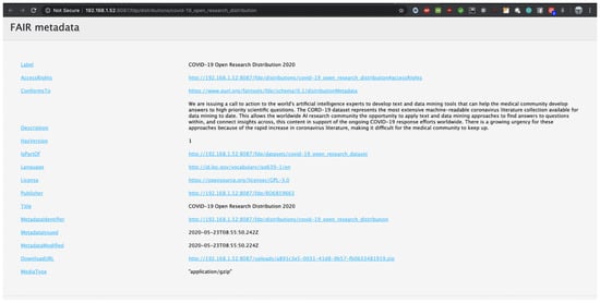 - Fair, R.T. FAIR Data Point Metadata Specification. 2020. Available online: https://github.com/FAIRDataTeam/FAIRDataPoint-Spec/blob/master/spec.md (accessed on 18 May 2020).
