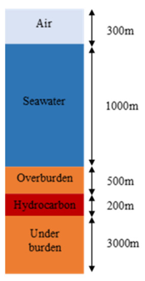 Representation of the synthetic seabed logging (SBL) model in the computer simulation technology (CST) software. The total height, width, and length are 5000 m, 20,000 m, and 20,000 m, respectively.