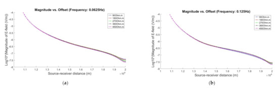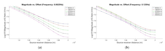 Based on Figure 3, the x- and y-axes indicate the source-receiver separation distance and magnitude of E-field in logarithmic scale, respectively. In this work, we observed 93 points of offset, which were from 10,845.77 m to 20,000 m. In addition, we tested multiple transmission frequencies to identify which frequency can give the best estimation of the hydrocarbon electrical resistivity based on the proposed inversion methodology given specific model conditions. To make the figure interpretable, the zoom-in scaled version of Figure 3 at far source-receiver separation distances is provided and depicted in Figure 4.