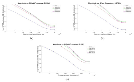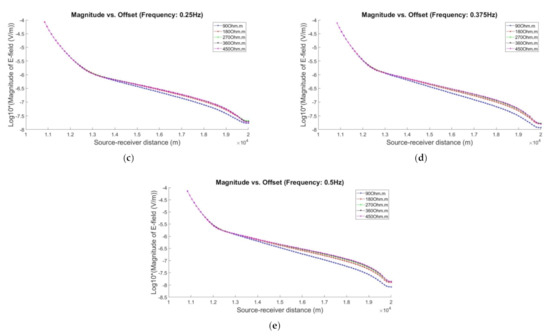 Magnitude of electric field (E-field) versus offset for five different hydrocarbon resistivities (90, 180, 270, 360, and 450 Ωm) for five different transmission frequencies: (a) 0.0625 Hz, (b) 0.125 Hz, (c) 0.25 Hz, (d) 0.375 Hz, and (e) 0.5 Hz.