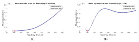 It must be noted here that the developed GP model is denoted as where all the EM profiles are evaluated at all training and testing input parameters. For every frequency, consists of 121 EM profiles observed at 93 points of offset from 10,845.77 m to 20,000 m with 121 different resistivities of hydrocarbon (90–450 Ωm, with a gap of 3 Ωm). Assume that the observational dataset is observed at = 93 points of offset, and there is a potential target layer resides 500 m underneath the seafloor with “unknown” resistivity. Then, the least square criterion is formed between the and the in order to determine the target electrical resistivity of the . This work uses mean squared error (MSE) as the objective function of the optimization scheme. Generally, MSE calculates the mean amount of squared differences between the and . The objective function is defined in Equation (8).