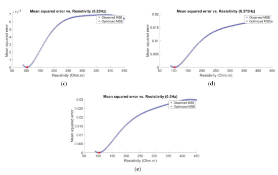 Mean squared error (MSE) versus hydrocarbon resistivity for multiple transmission frequencies (Observational dataset 3 with “unknown” resistivity of 400 Ωm): (a) 0.0625 Hz, (b) 0.125 Hz, (c) 0.25 Hz, (d) 0.375 Hz, and (e) 0.5 Hz.