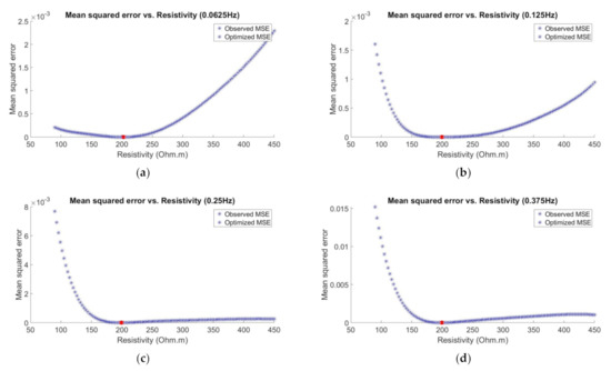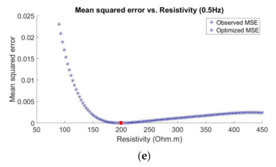 Mean squared error (MSE) versus hydrocarbon resistivity for multiple transmission frequencies (Observational dataset 2 with “unknown” resistivity of 200 Ωm): (a) 0.0625 Hz, (b) 0.125 Hz, (c) 0.25 Hz, (d) 0.375 Hz, and (e) 0.5 Hz.