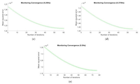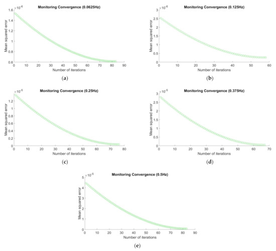 Mean squared error (MSE) versus number of iterations for multiple transmission frequencies (Observational dataset 1 with “unknown” resistivity of 100 Ωm): (a) 0.0625 Hz, (b) 0.125 Hz, (c) 0.25 Hz, (d) 0.375 Hz, and (e) 0.5 Hz.