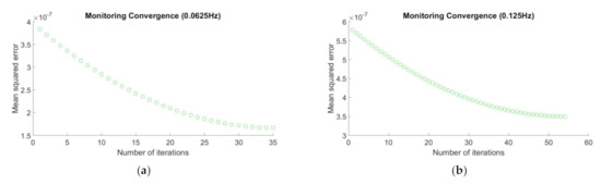 In Figure 9, Figure 10 and Figure 11, the x- and y-axes indicate the number of iterations and the computed MSEs, respectively. Based on these figures, we can see that all the optimizations converged to the smallest MSE with less than 100 iterations (maximum iterations number). Here, the most important thing is all the optimizations converged and stopped at the smallest MSE values and approaching to zero. It agrees the main goal of optimization scheme which is to minimize the loss function. Next, in order to make all the figures obtained easier to interpret, we tabulate all the resulting estimates, the validation results (i.e., absolute error), and the learning rate used for every observational data and frequency in table below.