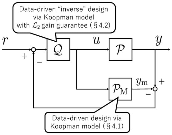 The modeling method is applied to data-driven feedback controller design based on internal model control (IMC [28,29]). IMC is a model-based control technique in which a plant model is directly embedded as part of the controller. Since IMC is compatible with data-driven modeling, there have been various work on data-driven IMC design. See, for example, the work in References [30,31,32,33]. The main drawback of conventional data-driven IMC is the fragility of the controlled system. There inevitably exists a modeling error in the plant model that may cause performance degradation and destabilization of the controlled system, in particular, when rich data is not available for modeling. In this paper, we address the data-driven design of a robust and reliable controller based on IMC in the following manner. First, we address forward modeling of the plant: a data-driven modeling method is applied to the operating data of a plant system to derive the plant model as an approximated Koopman operator. Secondly, we address backward modeling of the plant: gain-preserving data-driven modeling is applied to the same data to derive an inverse model of the plant system. Then, the two models are used to form an IMC-based feedback controller that robustly stabilizes the plant system.
