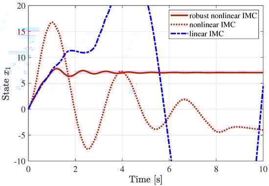 The simulation of regulation control achieved by the controllers is illustrated in Figure 7 and Figure 8. In the figures, the state trajectory achieved by the proposed constrained nonlinear IMC, unconstrained nonlinear IMC, and unconstrained linear IMC are drawn by the red, solid; red, dotted; and blue, dashed lines, respectively. We see that the proposed constrained IMC robustly achieves output regulation, i.e., converges to the origin under the presence of the modeling error, while the others cannot. This concludes that the proposed gain-constrained IMC contributes to robust stability for the control system.
