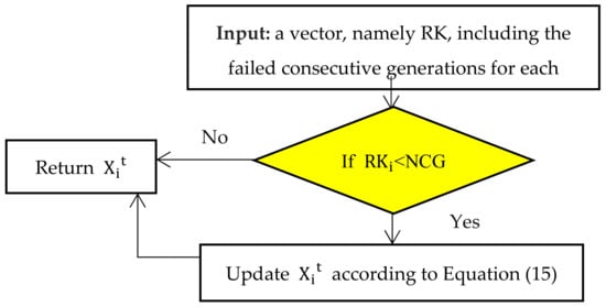 where tmax is the maximum generation. In this equation, within the start of the optimization process, the part taken of the best-so-far solution is very small, while the part taken by the unbeneficial solution is very high, which increases the exploration capability of the algorithm that decreases gradually as the optimization process progresses. Gradually, the part taken from the best-so-far is increased and the other part that is taken from Xit reduces, until reaching the end of the optimization process. In this case, the part taken of the best-so-far is so high compared with the part taken of the unbeneficial solution that is very small and this will encourage the exploitation capability. The unbeneficial solutions, according to [45], are extracted by calculating the number of consecutive generations (NCG) predefined by the researcher based on their experiments, in which those solutions couldn’t find a better solution than the last local best one. The flowchart of this strategy is given in Figure 2.